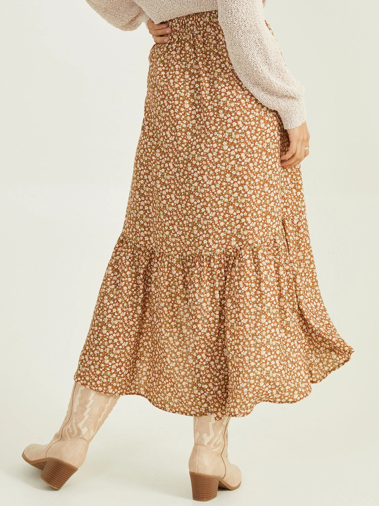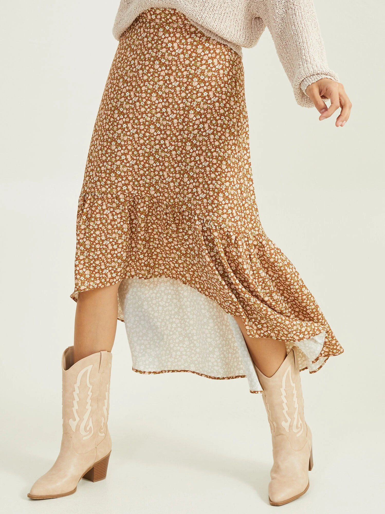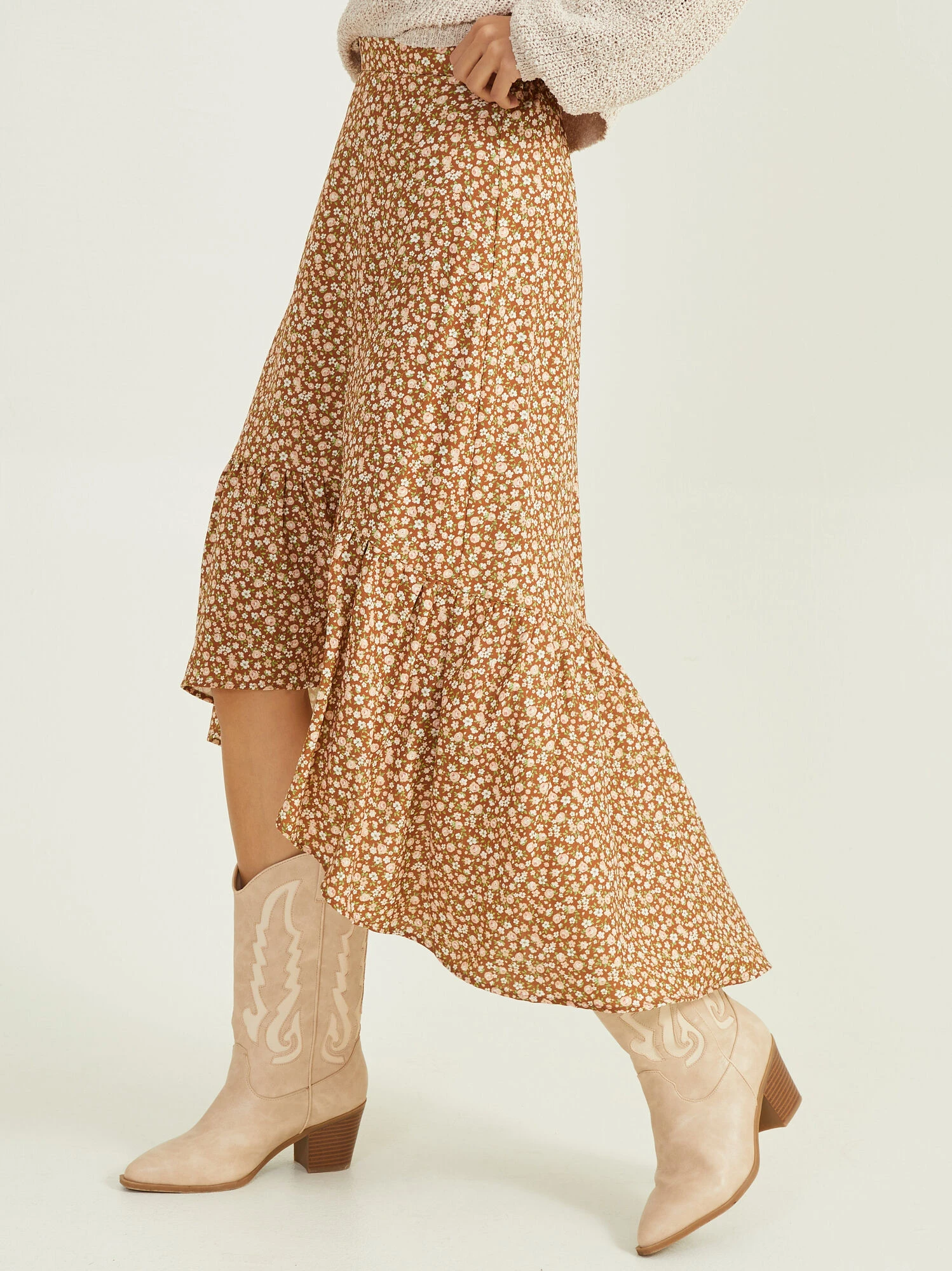 The Emilia Floral Midi Skirt is the perfect piece to add to your wardrobe this season. Featuring a high low hem, ruffle tier at the bottom, and an elastic waistband, this adorable skirt will keep you comfortable all day. Pair this skirt with a puff sleeve crop top for an elegant and feminine look!