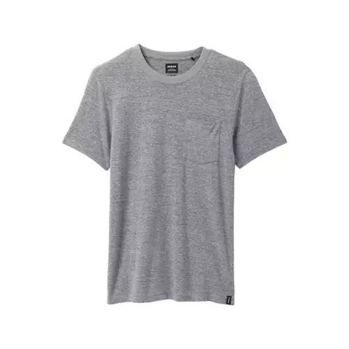 Hemp blend stretch knit • Solid colors double dye • Stripe colors Cardiff Feeder stripe • 1×1 stretch rib collar • Front left chest pocket • prAna woven label at front left hem • Slim Fit