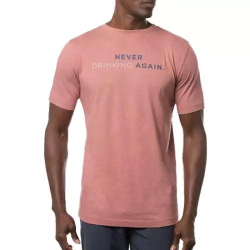 • Graphic tee that states “Never Drinking Again” on front, with “Someone Get Me a Beer” printed on back