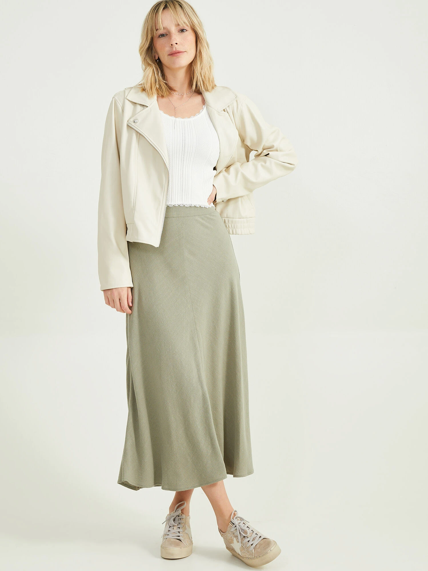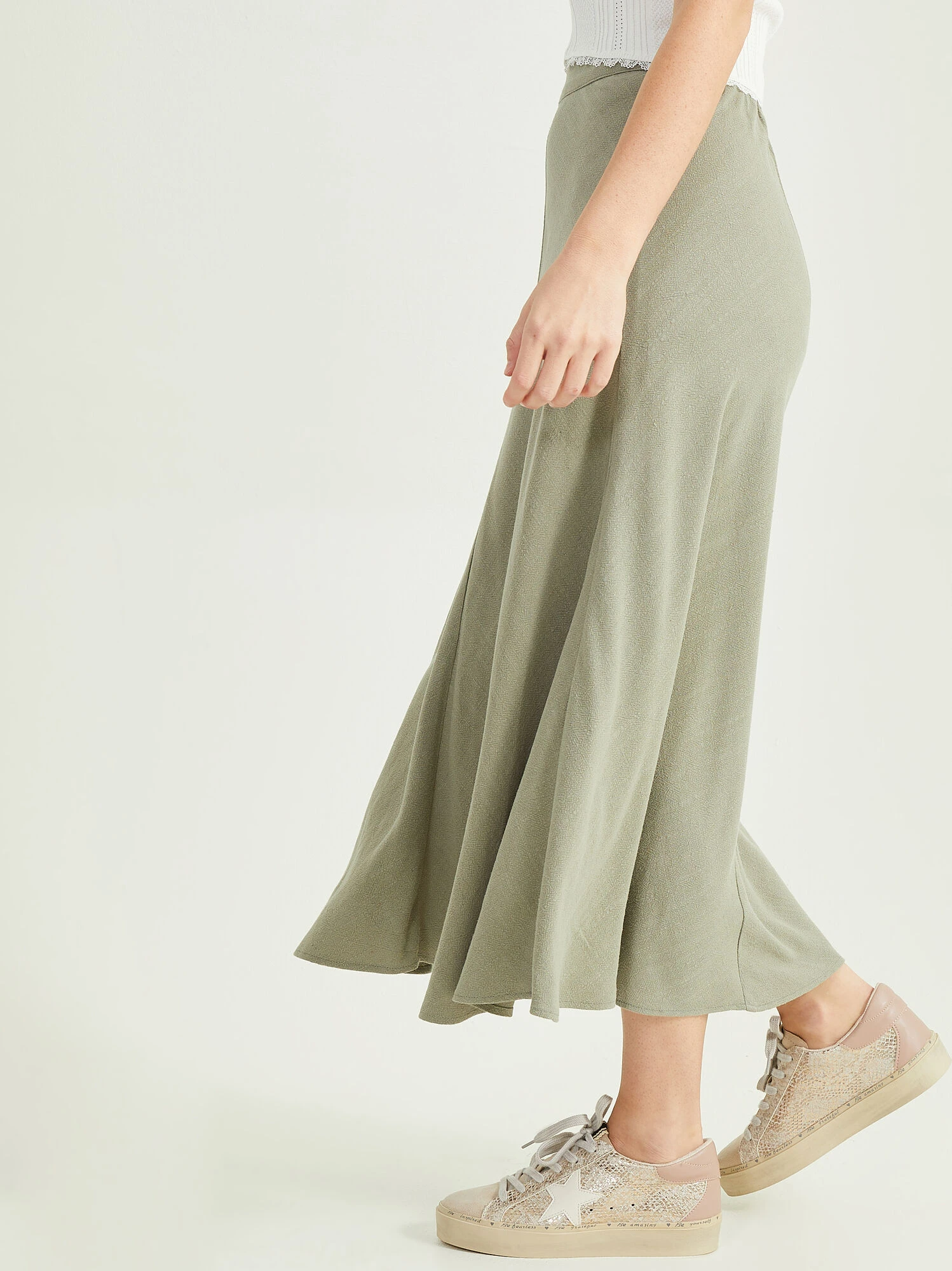 Add this midi skirt to your seasonal closet to bring in the warmer weather; it makes the perfect transitional piece. The breezy linen fabric is so soft and lightweight you will feel so comfortable no matter where you wear it. Style this relaxed skirt with a t-shirt and sneakers for a casual yet cute outfit!