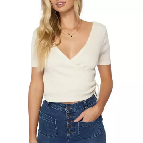 Freshen up your closet with this casual knit top. It has a front-wrap design, drawcord detail at the side seam and solid color wash.